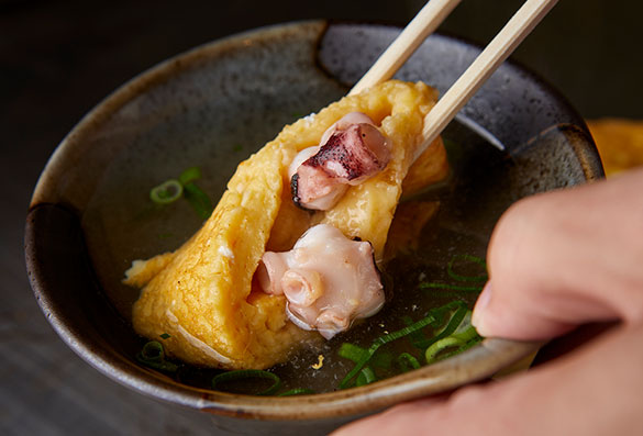 プリッとした弾力が心地良いぶつ切りのたこを鉄板で焼き上げ、玉子焼きで巻き込む当店の名物メニューです。明石焼の様にお出汁に浸して召し上がっていただく新感覚の美味しさは、大人から子供まで幅広い層から支持を集めています。鉄板焼のニューエイジをどうぞご賞味あれ!!